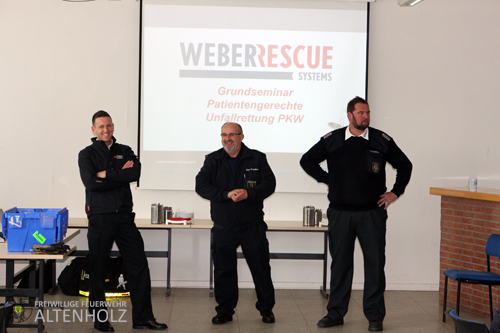 Der Samstag wurde von den Kameraden der Feuerwehr Altenholz und einigen Kameraden aus Nachbarwehren schon seit einiger Zeit freudig erwartet. Wir hatten die Ausbilder Björn-Jan Kleist und Michael Schermer von Weber Rescue Systems bei uns zu Gast. Den ganzen Samstag sollten sie uns neue Techniken und Ideen zur Patientengerechten Unfallrettung beibringen.